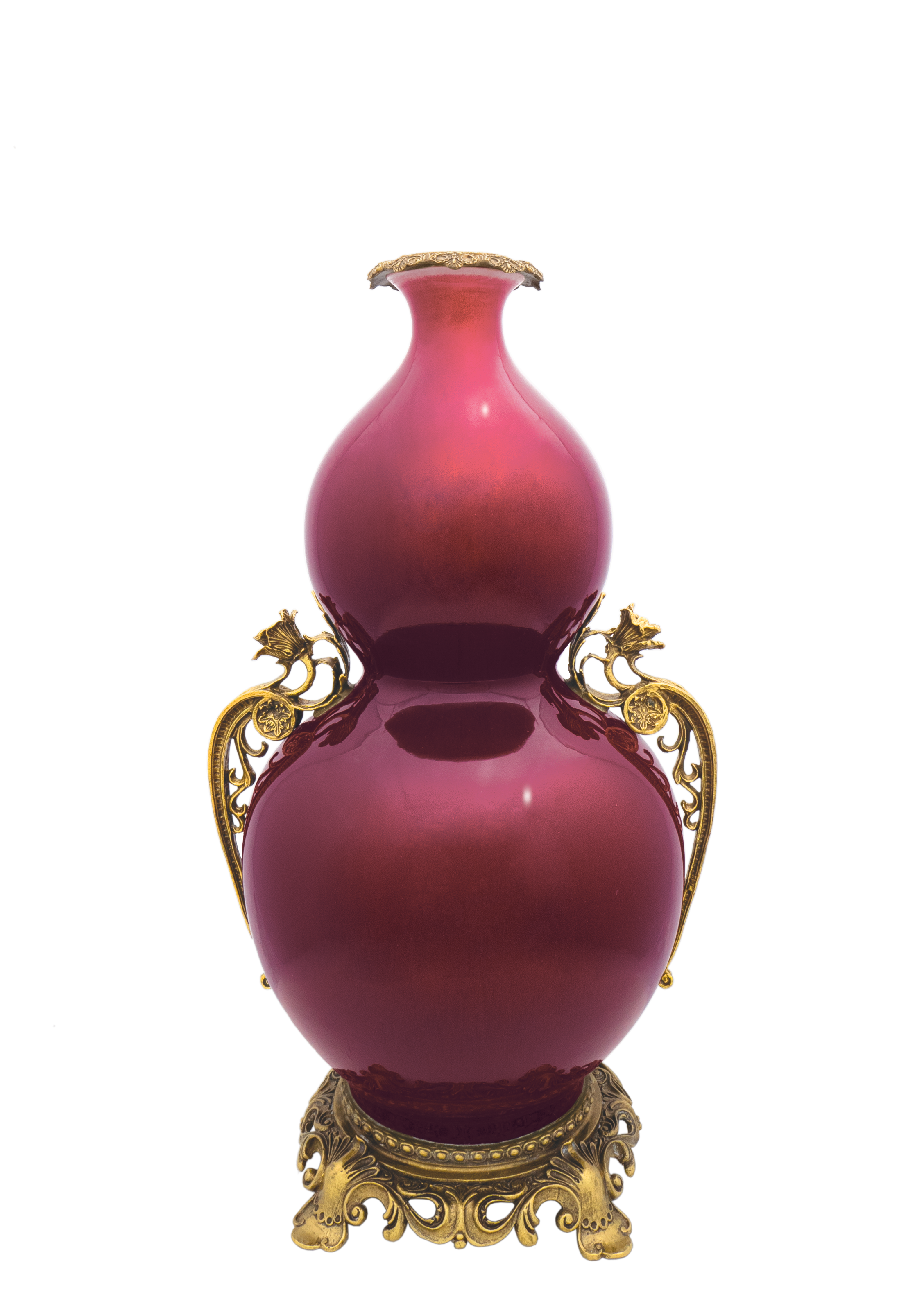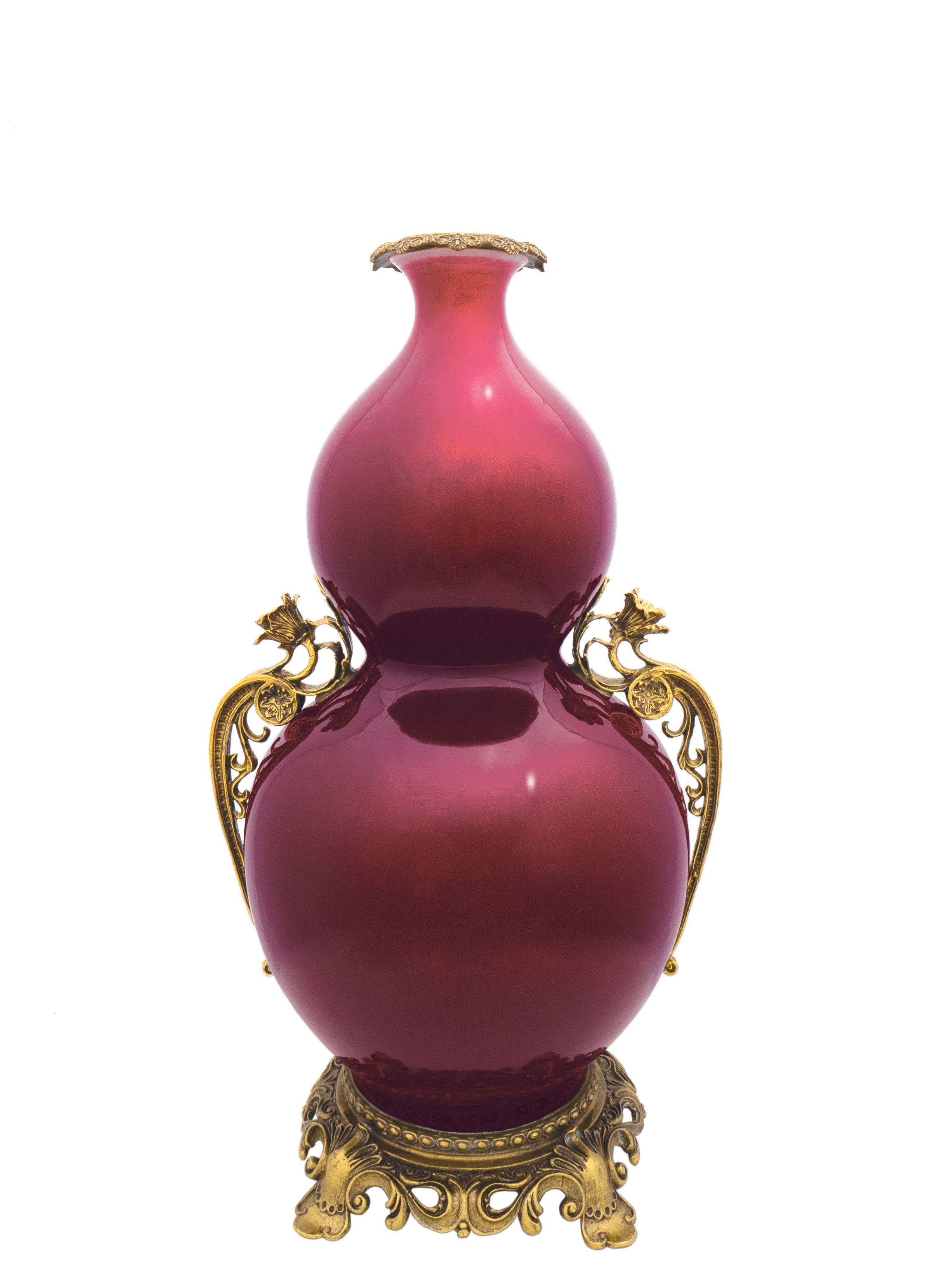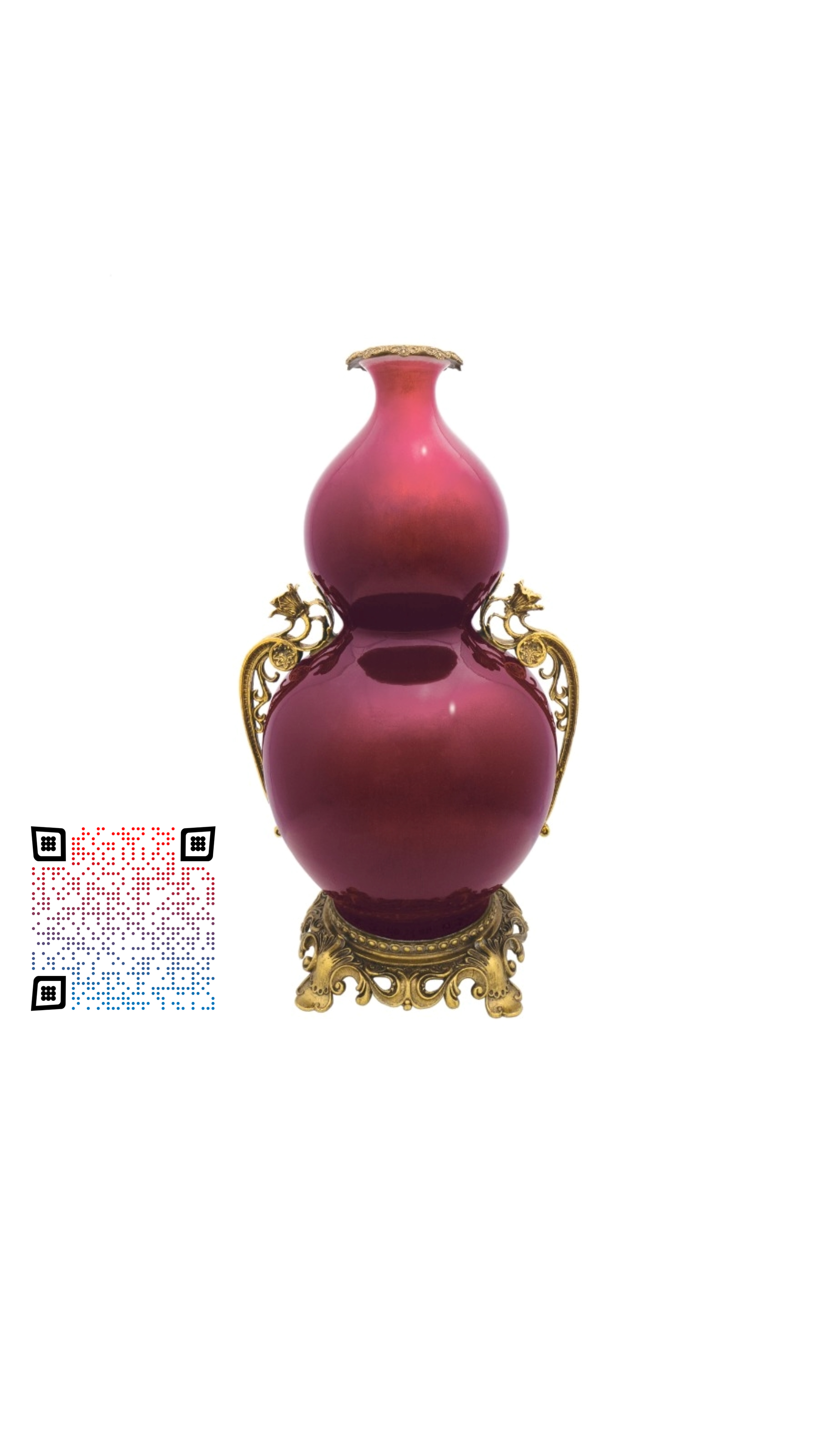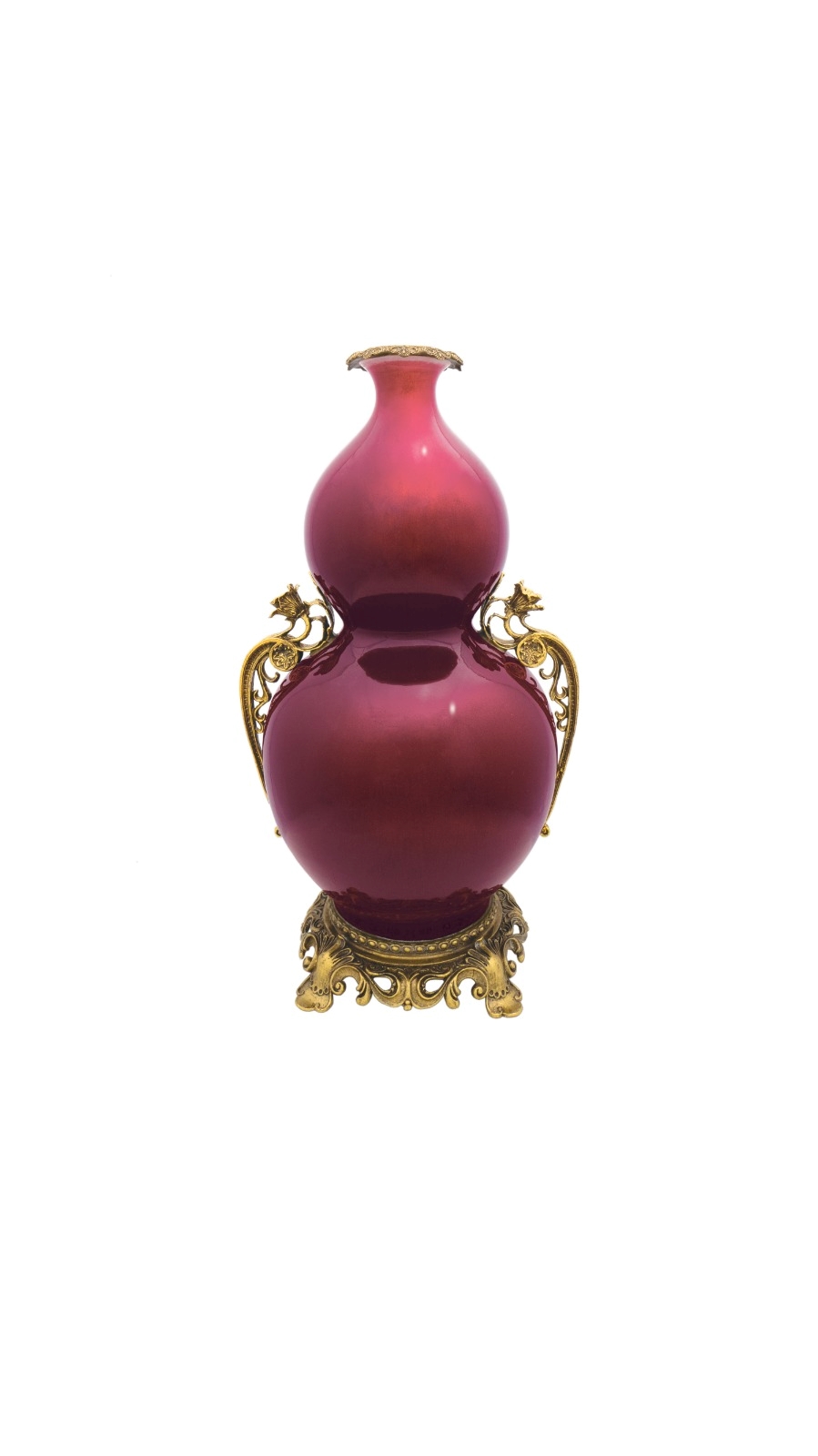 本拍品瓶呈寶葫蘆形,小口、短頸,上腹較小,下腹較大,束腰、圈足。瓶外施祭紅釉,釉色鮮亮,釉質光潤均勻。 此物件為回流藏品.從新鑲嵌金銅口、瓶身左右配上對稱鎏金銅雕花朵、圓形底座是高品質的法國鎏金銅雕,雕塑精美生動,華麗優雅。 祭紅釉源於元代,由釉裡紅脫胎而出,至明代永樂年間成熟,是顏色中的珍貴品種,因往往用作祭器而得名,也叫 「鮮紅」、「霽紅」、「積紅」、「際紅」、「醉紅」、「寶石紅」。「祭紅」製作之難遠甚於其它顏色釉,文 獻記載祭紅「以西寶石為末入釉」,故又稱為寶石紅。 葫蘆形瓶是中國古代陶瓷中的傳統造型,葫蘆實有「福、祿」的諧音之稱,喻意福祿萬代,葫蘆的多籽與纏繞的藤蔓被人類賦予多子多孫和延綿不斷繁衍的含義、葫蘆也是道教的聖物,既是通往仙境的法物,也是存放金丹的容 器。此瓶造型飽滿端莊秀美,比例合宜,婀娜流暢,釉色莊重沈靜,為收藏之良選。本拍品市場價值。