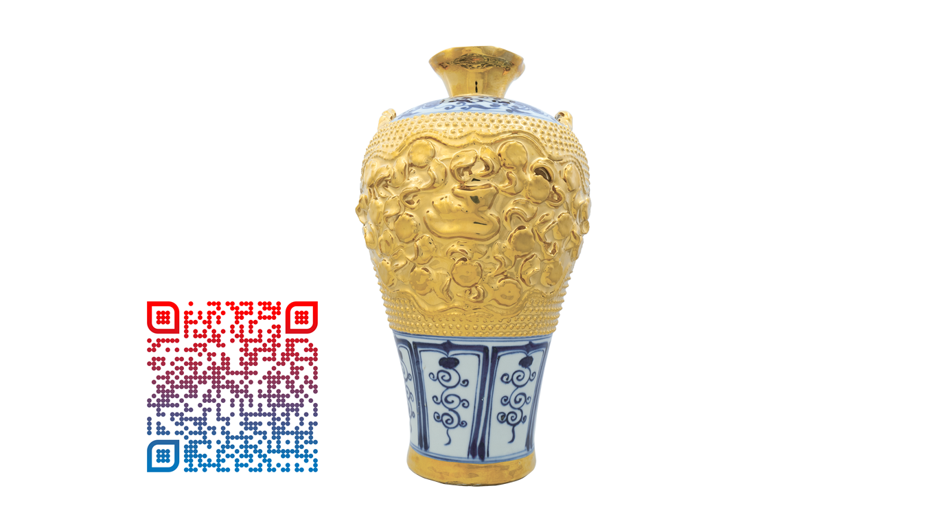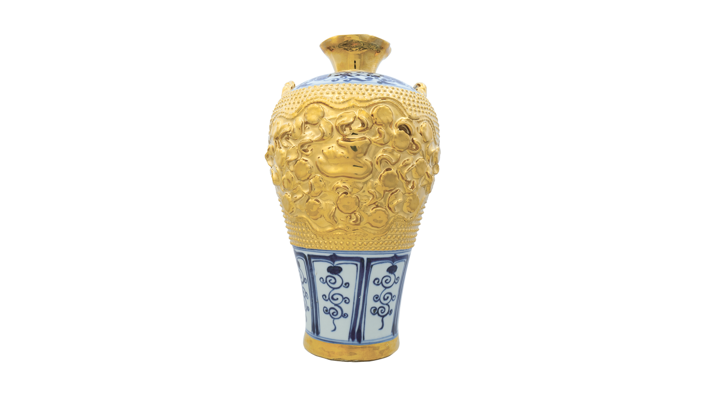 This item has a short neck that transitions to broad shoulders, a slender body and a short, rounded foot. Its rim is small and folded. The piece features a high profile, and the texture is thick and hard over a smooth glaze of blue and white. The shoulders are lavishly embellished with patterns of jewelry and entangled lotus branches, while the upper body, rim and foot are gilded. The remainder of the vase is rendered in a thick blue-and-white glaze that carries a soft gleam. The verdant color makes the piece exquisite and polished, just like a timeless painting.