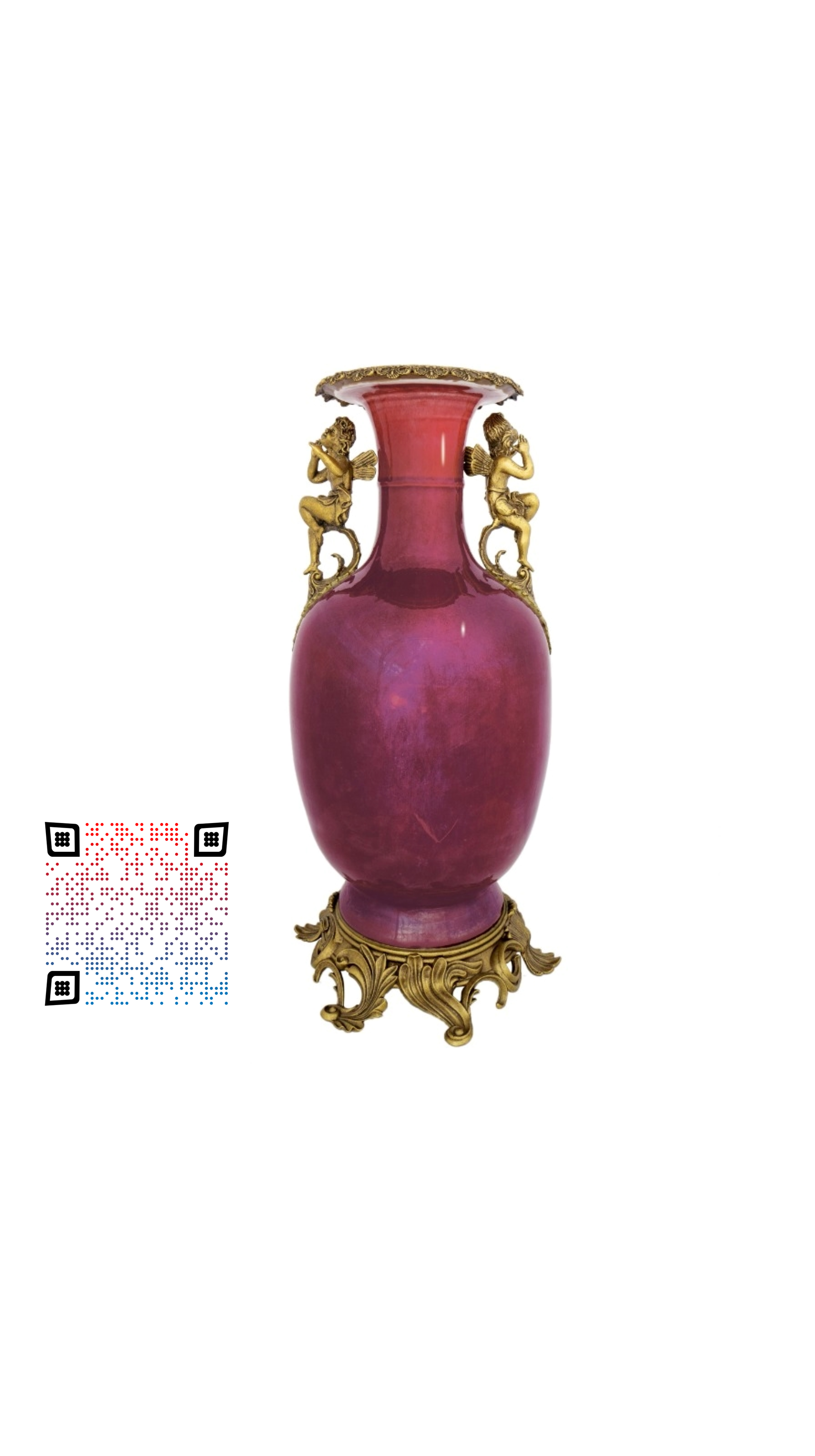 This Guanyin vase in the altar-red glaze has a wide flared mouth, a straight neck and broad shoulders. The body, long and smooth, shrinks till the shallow foot. This piece, recovered from overseas, bears a gilded-copper rim and phoenixes on the two sides of the body, which were added later. The circular base -- a gilded-copper sculpture of French origin -- is exquisite, vivid, gorgeous and elegant. The altar-red glaze is pure, graceful and attractive. Additionally, this vessel is distinguished by a regular shape and a unique form. It is solemn, lustrous and free of cracks.