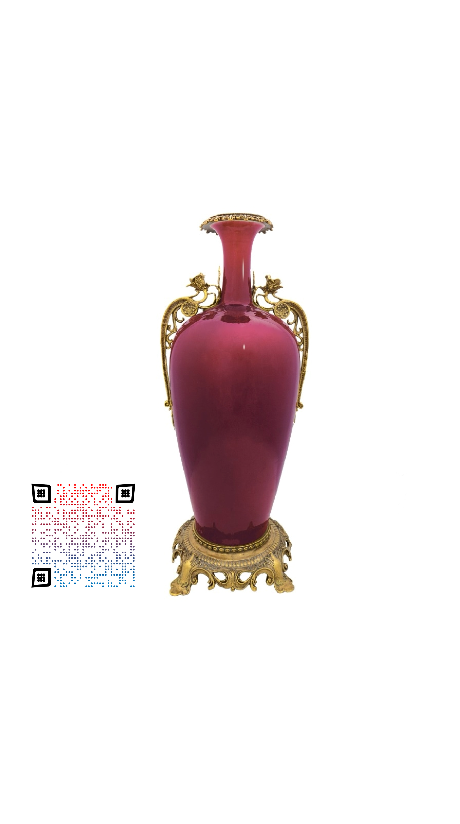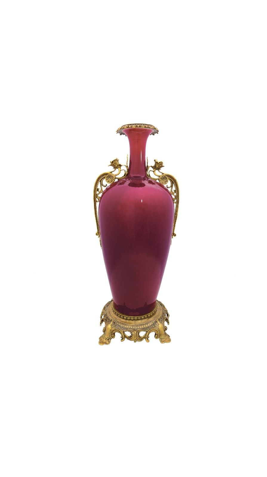 This Guanyin vase in the altar-red glaze has a wide flared mouth, a straight neck and broad shoulders. The body, long and smooth, shrinks till the shallow foot. This piece, recovered from overseas, bears a gilded-copper rim and the shoulders of the body are embellished with gilded-copper flowers. The circular base -- a gilded-copper sculpture of French origin -- is exquisite, vivid, gorgeous and elegant. The altar-red glaze is pure, graceful and attractive. Additionally, this vessel is distinguished by a regular shape and a unique form. It is solemn, lustrous and free of cracks.