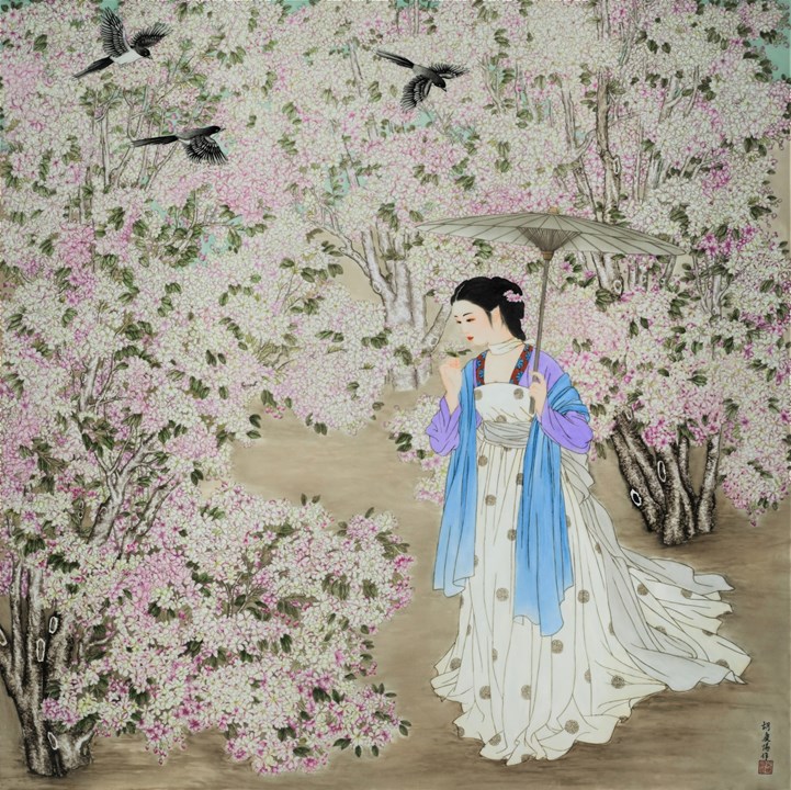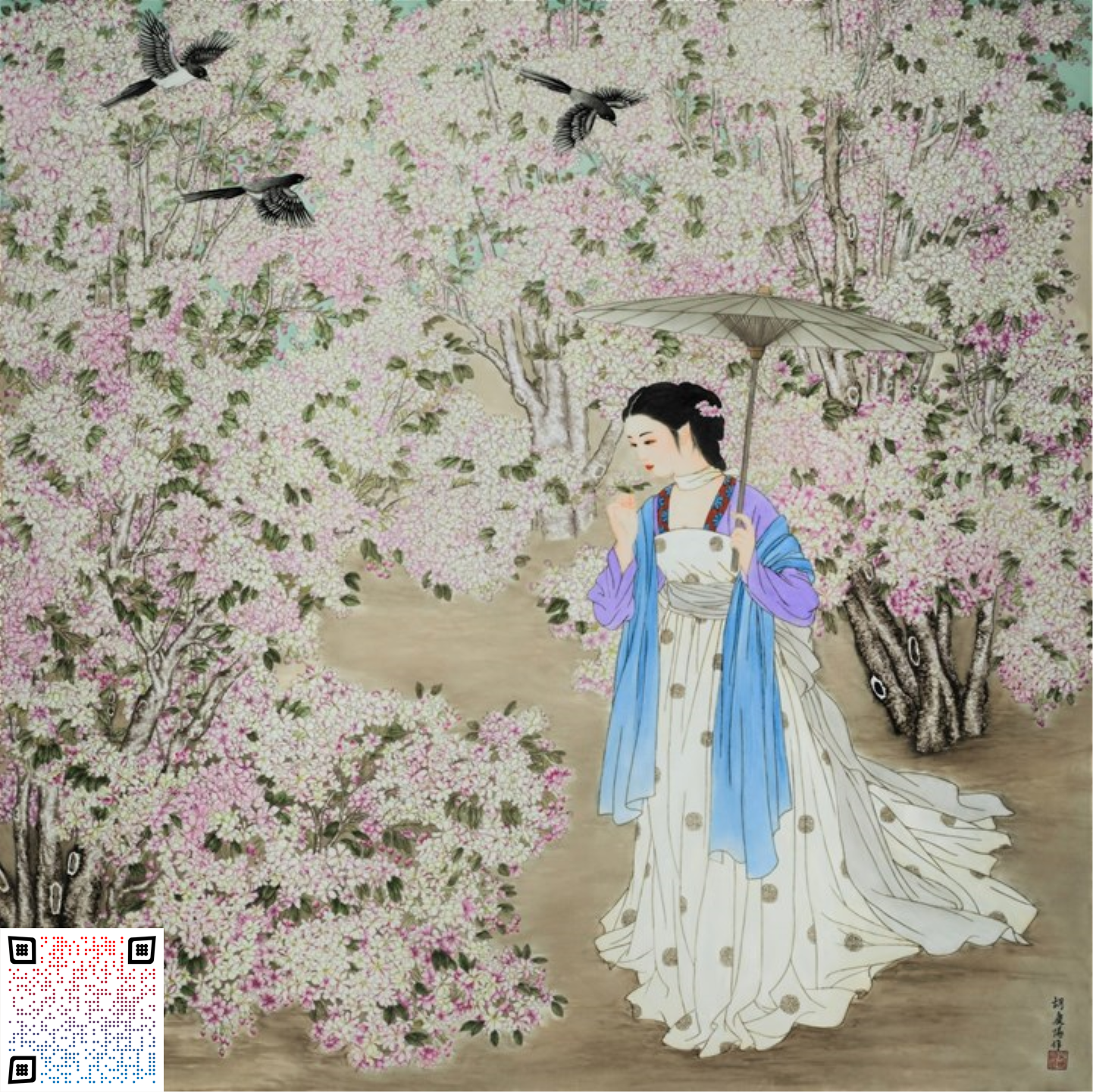 This painting by Mr. Hu Qingyang incorporates modern elements into traditional Chinese brushwork styles. The effect is noble and refreshing, making it a rare masterpiece. The work is composed of spring flowers all over the mountains, a beautiful lady, and magpies squeaking in the air, announcing the good news about spring. This painting brings all the tenderness and beauty together to enjoy the present moment and appreciate every beauty of the moment.