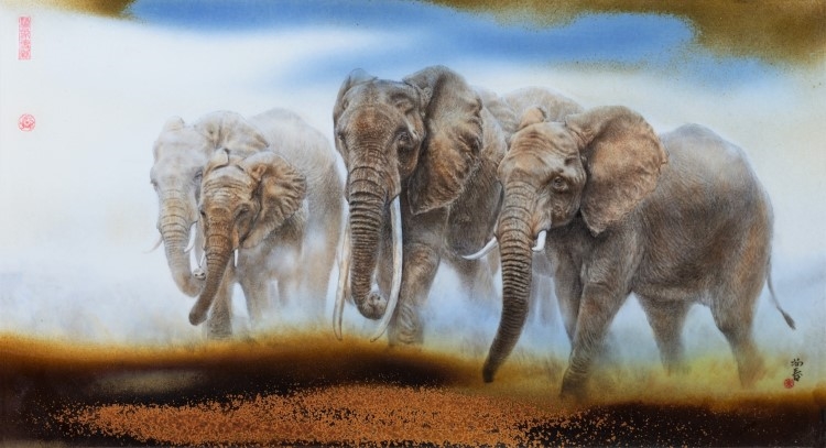 “Everything takes on a completely new look” is derived from “everything becomes new” in the poem, Bayun-style poem titled “Fresh Snow” by Xue Neng in the Tang Dynasty. It means all manifestations of nature acquire a completely new outlook. This painting, in fresh and lively tones, depicts a herd of elephants thundering over the sunlit grassland, and in doing so it implies the endless potential of possibility.
