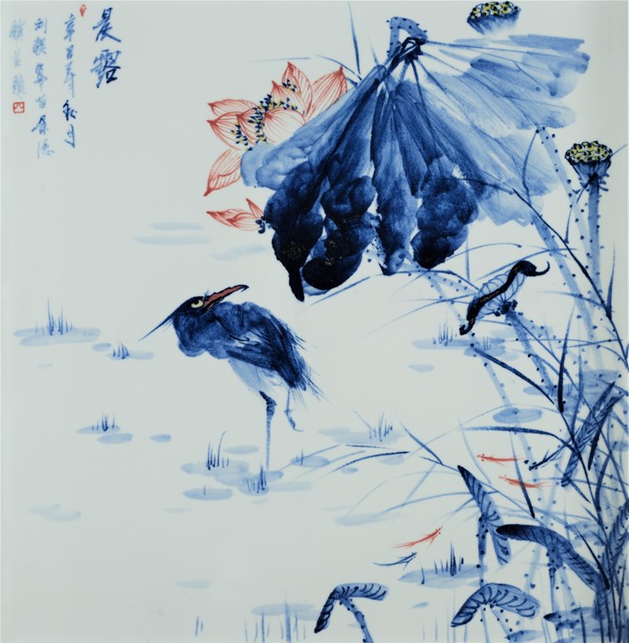 This work features underglaze blue and wucai painting of the scenery of birds seeking for food in the lake in early morning in traditional Chinese ink and colour painting style.