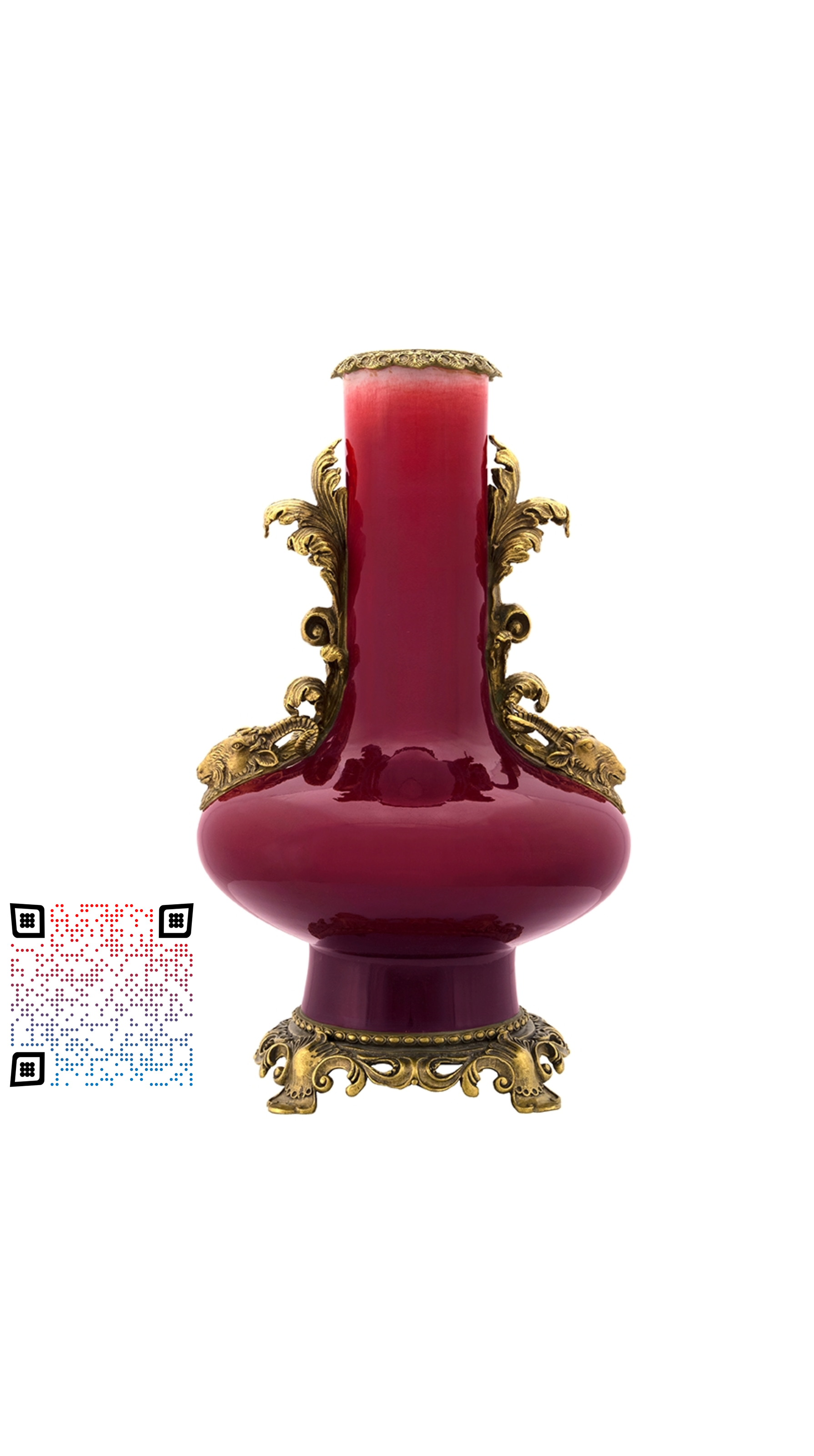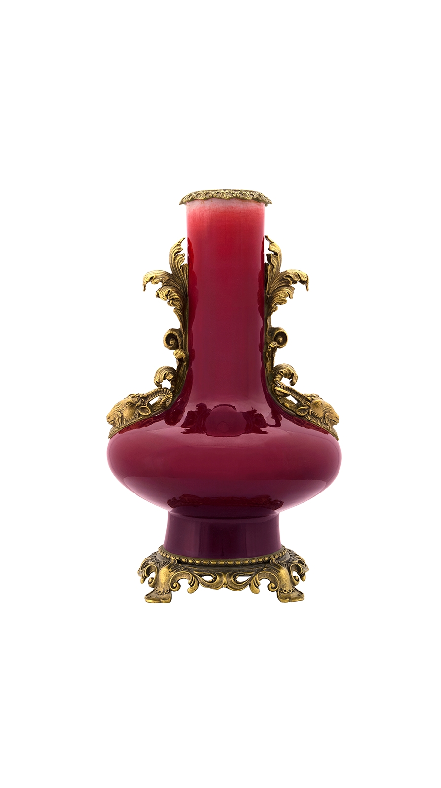 In ancient times, this long-neck vessel in the altar-red glaze generally served a sacrificial purpose in the life of a royal household. It isn’t merely a bauble, though, as the ingredients of the altar-red glaze include precious gold, corals, agates and jades. The altar-red glaze, translated from ji hong (“祭红” or “霁红” which refer to the same type of glaze), was, like the Zun form, invented during the Kangxi reign. This tinted, high-temperature glaze is regarded as a treasure by kiln masters, due in part to the exceedingly difficult process involved in its production. This tinted, high-temperature glaze is regarded as a treasure by kiln masters, due in part to the exceedingly difficult process involved in its production. The altar-red glazed ceramic bears a thick but solemn color, which denotes the sophistication of the process. Thus, perfect examples are very rarely seen. Nevertheless, no expense was spared in production. In other words, this altar-red glazed ceramic is the zenith of traditional Chinese ceramic products, and its altar-red glaze is a pearl among tinted, high-temperature glazes.