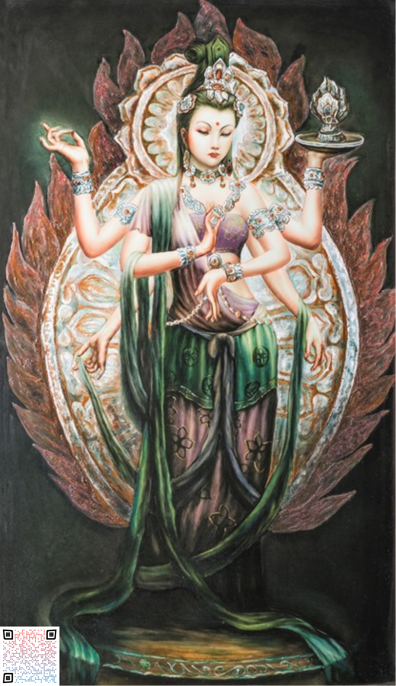 Ruyilun Guanyin, one of the incarnations of Avalokitesvara Bodhisattva, has two arms, four arms, six arms, eight arms, ten arms or twelve arms, among which the image with six arms are the most popular. This Bodhisattva image is popular in Ceylon, Java, Japan, China and other places. The maker of this work presented this traditional Chinese Buddhist theme in the western oil painting style with the overglaze pile enameling technique which he invented. The style of this work is innovative and unique, and therefore this work is highly collectable.