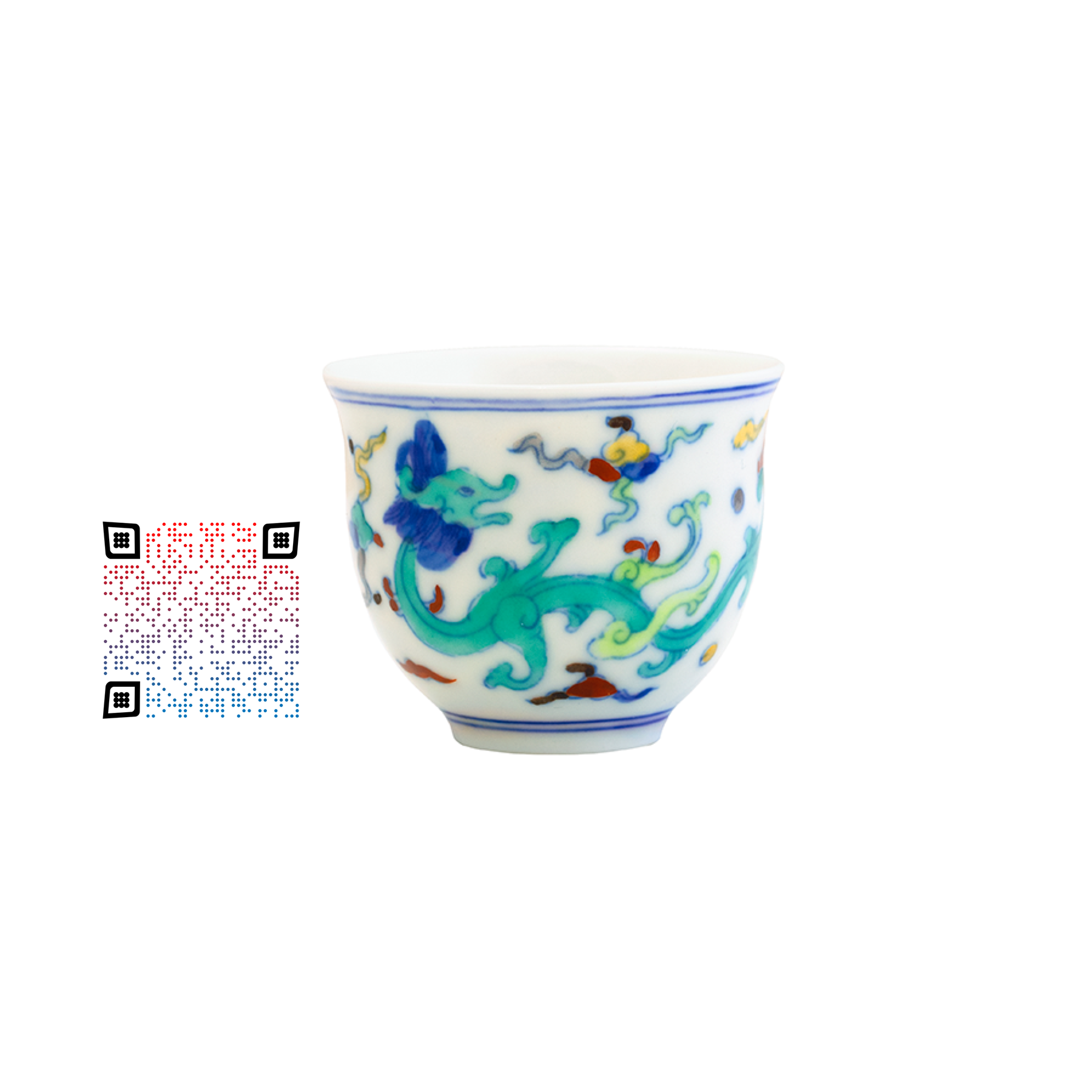 This item is a modern cup with a Kui dragon in contrasting colors and the style of the late Chenghua reign of the Ming dynasty, produced in Jingdezhen during contemporary times. The diameter is 6.2cm. This item has a flared rim, a straight and slightly tapered body, and a short, rounded foot. Its biscuit ceramic is paper-thin, while its glaze is creamy and lustrous. There are circles in the blue glaze on the outer surfaces of the rim and foot. Two dragons frolicking with a pearl adorn the body in multiple glazes, which include blue and green. The two dragons look back and stare at each other while flying and chasing the pearl among the clouds. The inner wall is white-glaze. As the saying goes, official kilns in the Chenghua reign of the Ming dynasty did not produce large ceramics. Instead, these official kilns preferred small but exquisitely designed products. This cup is a representative of such ceramics. Its biscuit ceramic is white and fine, as well as even and thin. Hence, this item belongs to the category of "bodiless ceramic.”