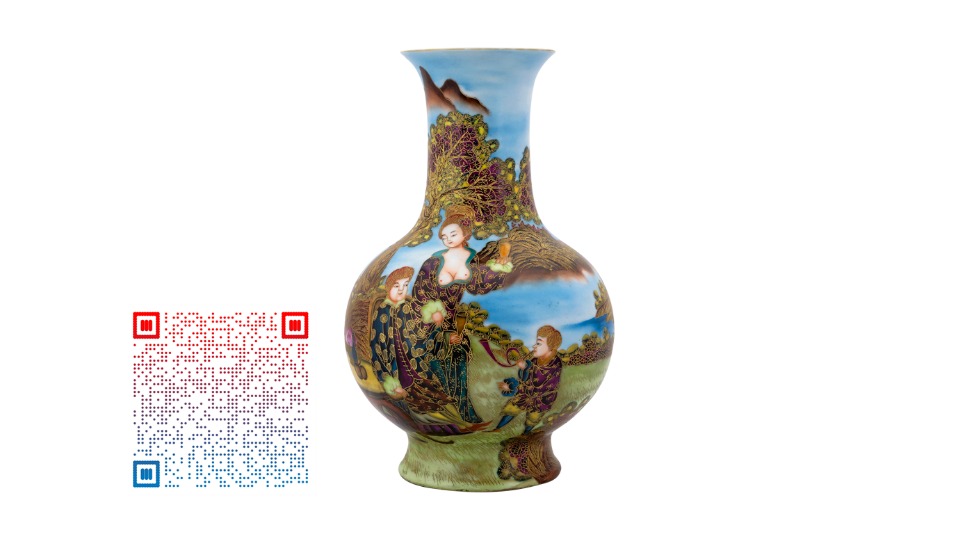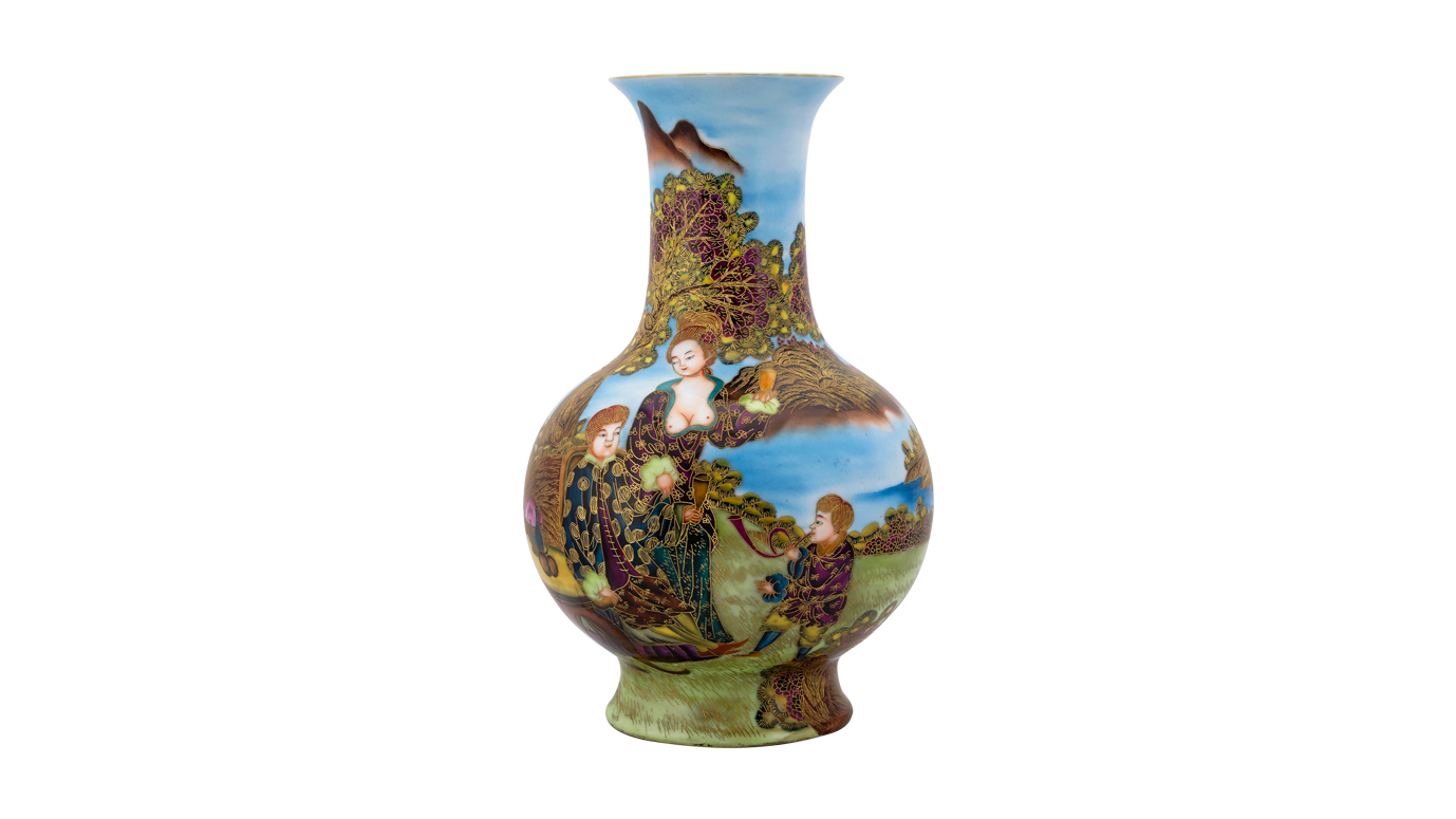 This item has a thick, lustrous glaze, and the colors are rich. Covered by a translucent glaze known as glass white, the colors, once fired, took on a brilliant gleam. The overglaze ceramic--innovative for its time--originated during the Kangxi reign of the Qing dynasty. Thus, it bears characteristics of the preceding dynasties. During this period, multicolor ceramic was the most distinctive. In fact, overglaze blue was created at this time, and painting became more delicate and elegant. Colors varied as well, with some being lavish and others being gossamer-thin. The figures on the piece are Westerners, including men and a woman whose breast is bared. The blue glaze is bright and glossy, while the green glaze is fine and gentle. The blue glaze is translucent and thin, while the thick, bright yellow glaze is used to depict hair, eyebrows and eyes or to sketch contours. The three characters are relaxing amid the sensual delights of a garden.