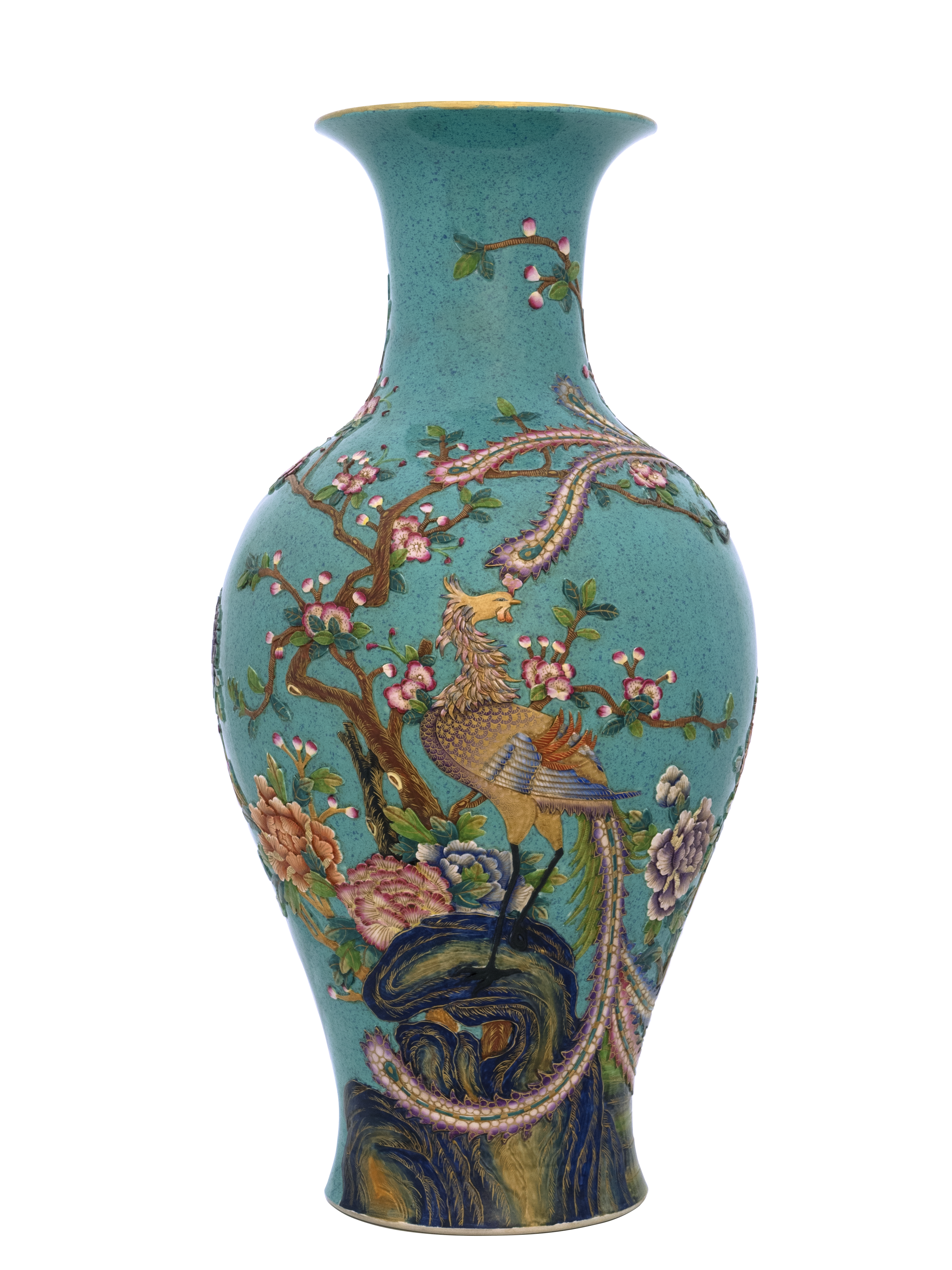Guanyin Vase, also known as “Guanyin Zun,” was one of the vase models popular during the period from the Kangxi to Qianlong reigns of the Qing dynasty. Such vase has a wide flared mouth, short neck and broad shoulders. The body, long and smooth, shrinks till the foot that is shallow, round and open. This type of vase was generally produced in Jingdezhen during the Kangxi reign. Sometimes, it is not easy to distinguish between vase and Zun. Generally, a vessel with a small mouth and big body is called a vase. Multicolored and blue-and-white are common. The outer wall of this vase is decorated with multicolored flowers on a ground of blue with phoenix tail-like fine lines. The lower body is in the turquoise glaze. The fine and lustrous glaze and the beautiful and tall model imply the strict and classic requirements for lines during the Qing dynasty. The line of ceramic work was meticulously designed inch by inch to obtain impeccable smoothness and elegance. The perfect line sets off the enchanting and graceful painting. The complementary phoenix and peonies demonstrate natural beauty, fascination and superb painting techniques. This feast for the eyes, through the glamorous artistic conception, represents the pursuit of auspiciousness, beauty and fortune.