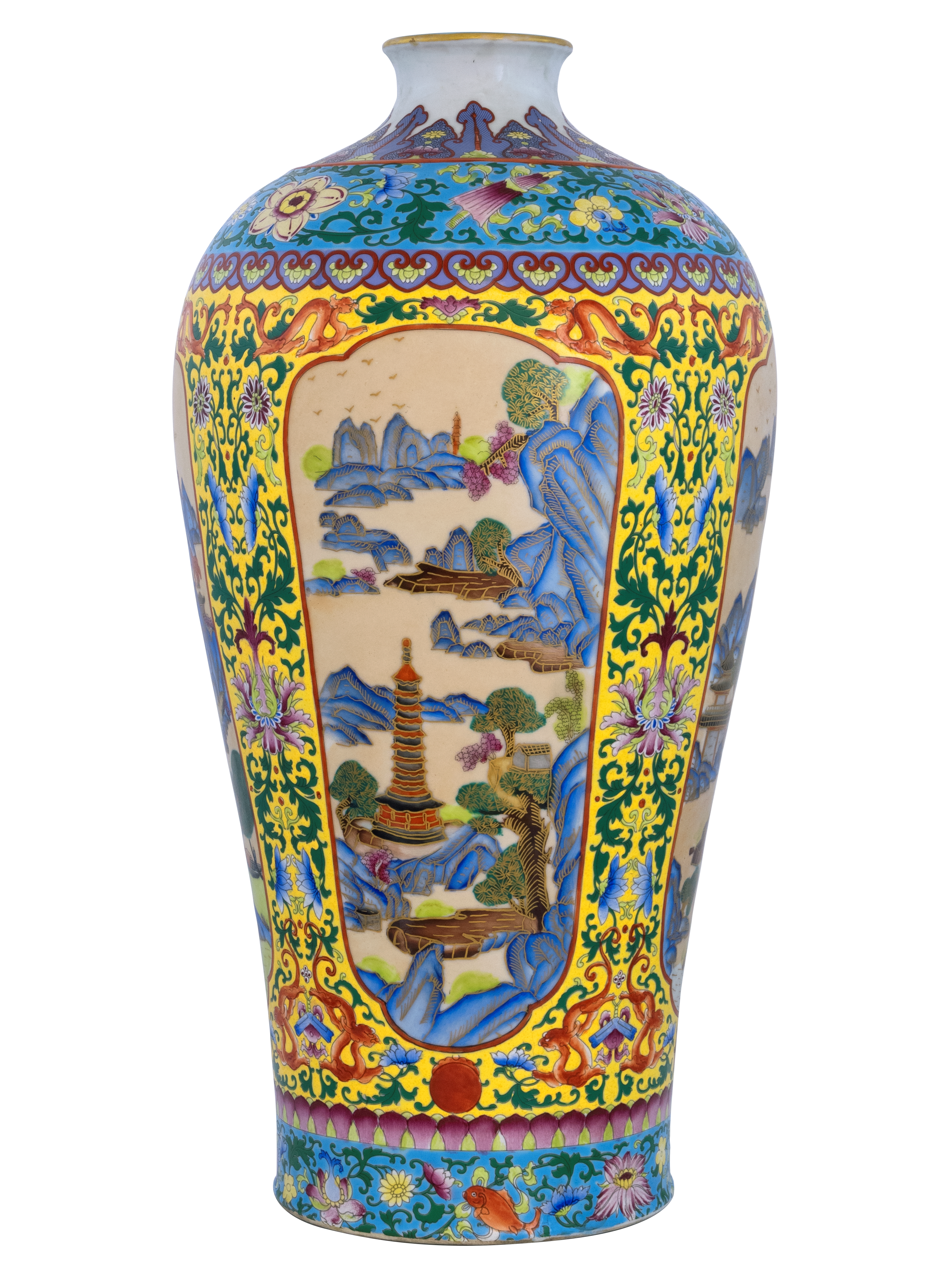 Modern Prunus Vase in Foreign Colors on a Background of Yellow with Landscape - CIMB-CAP-2203-017