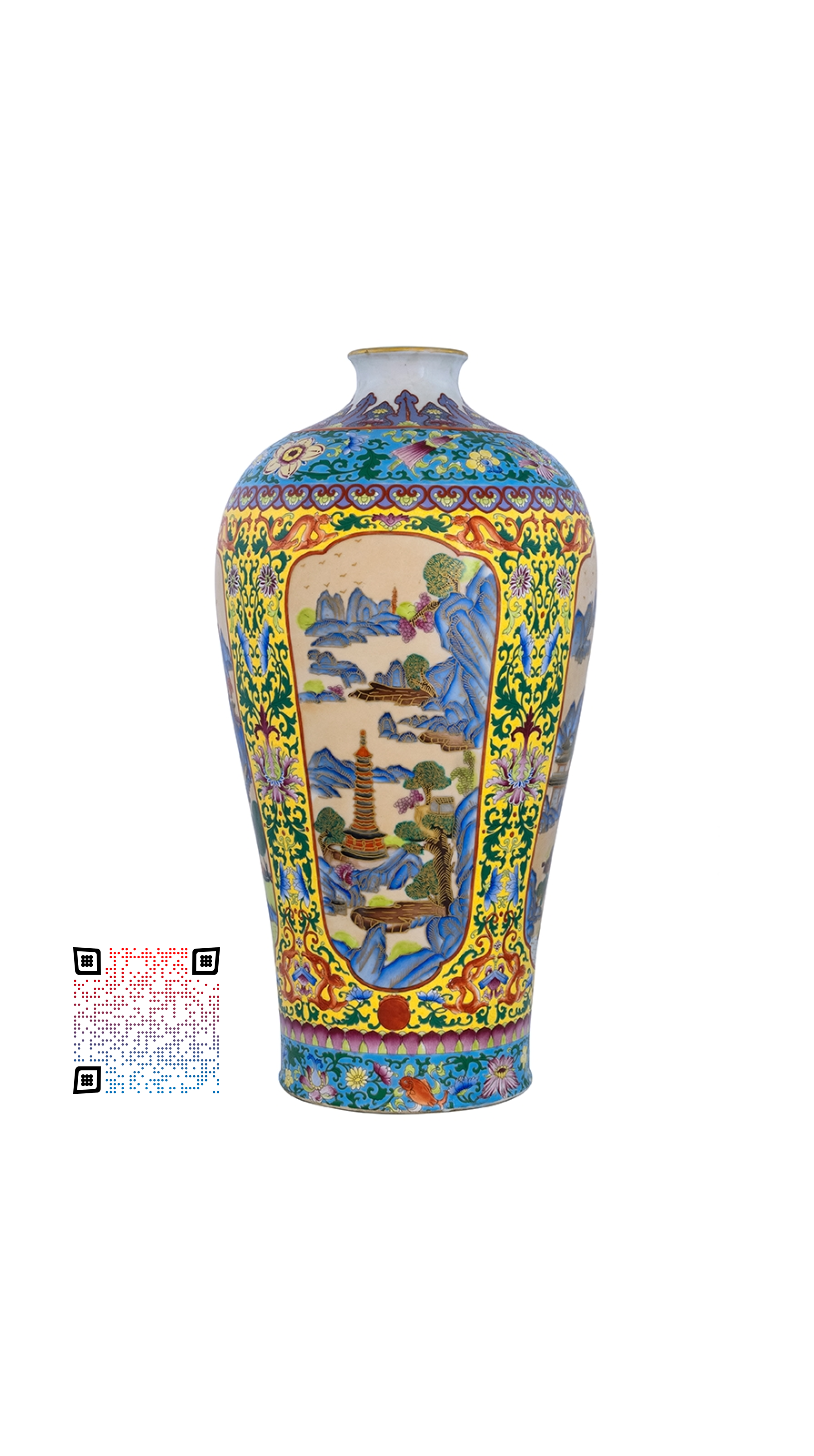This prunus vase is a rare modern masterpiece in the style of multicolored ceramic of the official kiln in the Qing dynasty, indicating an extremely high burning capability. Prunus vases were a type of high-level funerary object during the Ming dynasty, with the auspicious meanings of safeguarding tombs and driving out evil spirits. As symbols of status, such vases also correlated to the tenets of Feng Shui. Only the royal family, feudal lords and important officials could “enjoy” the prospects of such funerary objects.