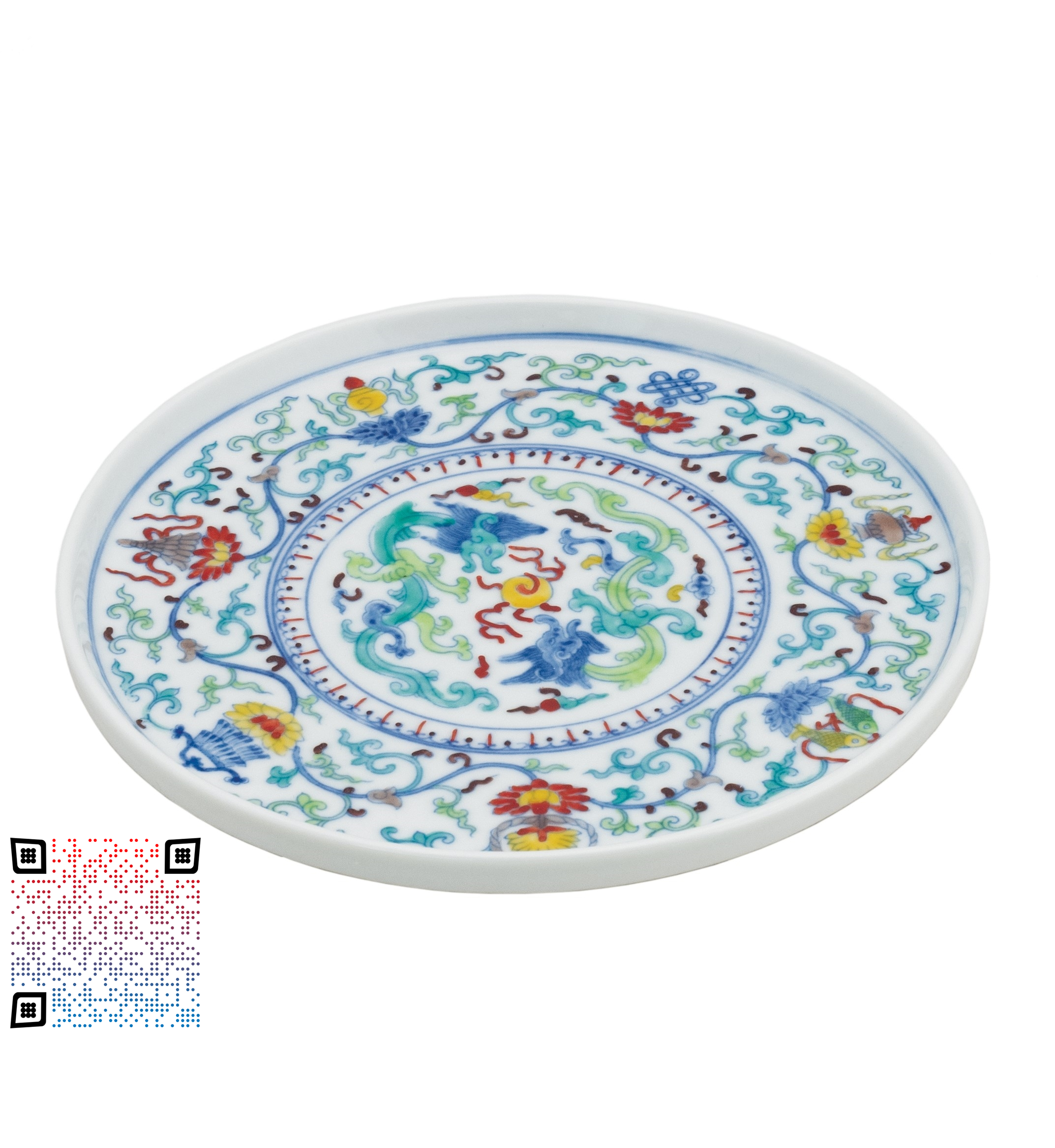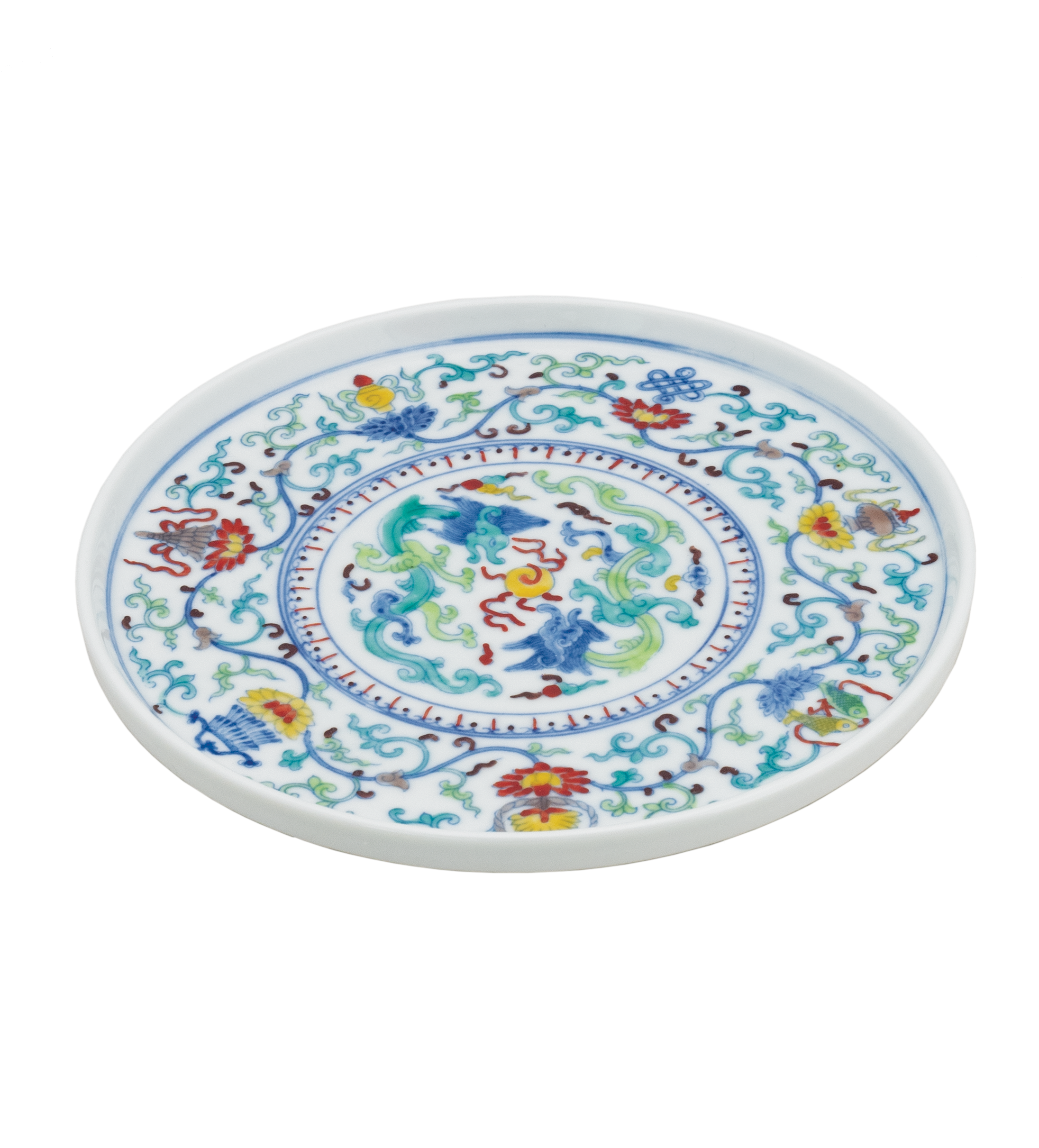 This item is a modern tea plate with Kui dragons in contrasting colors and the style of the late Chenghua reign of the Ming dynasty, produced in Jingdezhen during contemporary times. The diameter is 21 cm. This item has a flared rim and a short, rounded foot. Its biscuit ceramic is paper-thin, while its glaze is creamy and lustrous. There are circles in the blue glaze on the outer surfaces of the rim and foot. Two dragons frolicking with a pearl adorn the body in multiple glazes, which include blue and green. The two dragons look back and stare at each other while flying and chasing the pearl among the clouds. The inner wall is white-glaze. As the saying goes, official kilns in the Chenghua reign of the Ming dynasty did not produce large ceramics. Instead, these official kilns preferred small but exquisitely designed products. This plate is a representative of such ceramics. Its biscuit ceramic is white and fine, as well as even and thin. Hence, this item belongs to the category of "bodiless ceramic.” The glaze is gentle and lustrous with extremely tiny air bubbles, making this item as beautiful as mutton-fat jade. Clashing colors, also known as "blue-and-white plus bright colors" or "bright colors on a blue-and-white ground,” means the underglaze blue-and-white color and the overglaze colors stand in contrast to one another.