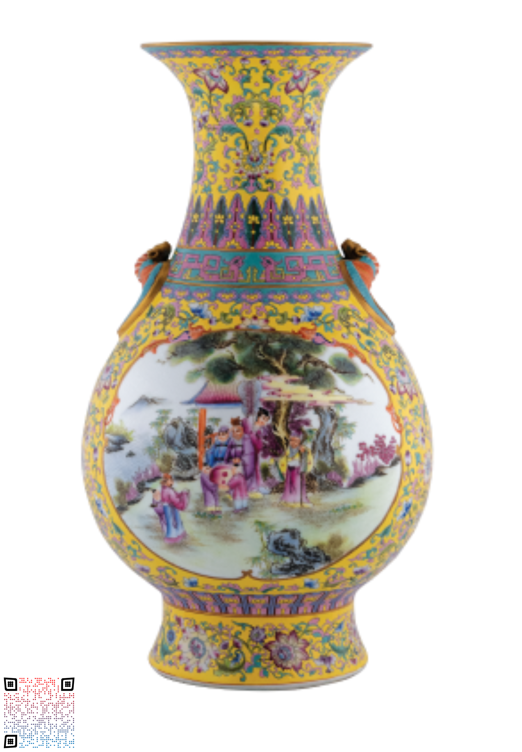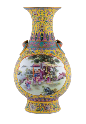 This Yellow-glazed Wucai Dual-lug Vase with Character Stories features a thick, full-bodied base, with excellent glaze, and a yellow-glazed brocade ground pattern, with a gold-rimmed hollow motif: Character stories are painted with exquisite patterns, rich and vivid colors, as well as delicate and sophisticated craftsmanship. The appearance is flawless, and it is one type of overglaze color styles. The process consists of billet glazing and firing in the kiln, then painting on the glaze, followed by a second firing in the furnace. As early as during the reign of Emperor Kangxi of the Qing Dynasty, the Wucai art, as the technique of overglaze color, had begun to emerge, and during the reign of Emperor Yongzheng, it had matured and formed a unique style of Wucai decoration, and during the reign of Emperor Qianlong, the Wucai art had become highly prosperous. Most of the subjects are based on daily life, with familiar characters and stories, flowers, birds and animals etc., and the social and cultural atmosphere of the era was concentrated on the exquisite and beautiful ceramic, with special craftsmanship and unique effects. The abdomen is painted with character stories in powder enamel, with a variety of figures featuring vivid forms, refined ornamentation, full composition, and elegant coloring. The entire piece was exquisitely made, highlighting the mastery of the craftsmen on the painting skills and making it a preferred choice for collection.